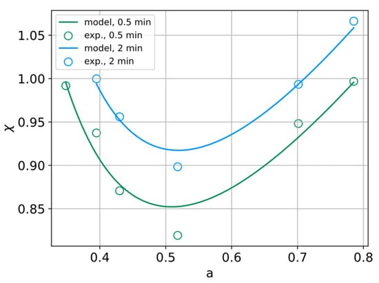where constants A and B are 0.074 and 1.12 for the 0.5-min data and 0.082 and 1.18 for the 2-min data. The exponents could be related to the molar relationship in Equation (1). This model represents the best fit obtained by varying both the exponents and the constants in front of each activity. The relatively good fit indicates that the observed deviations from t.e. with respect to stoichiometries could be attributed to the inter-relationship between the activities of the main components. This understanding is valuable for predicting process outcomes, given that a larger deviation from t.e. for S1.2 was observed in pilot-scale studies [