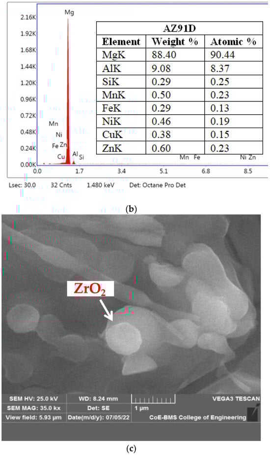 Top view morphologies of coated and uncoated AZ91D are shown in Figure 3a–c. The topographic view of ZrO2 and Si + ZrO2 coating exhibited a uniform homogeneous distribution of particles, and no voids were observed. On increasing beam current, a greater deposition of bioceramic particles on the substrate was detected. Figure 3c shows the deposition of spherical-like particles of ZrO2 on the surface, whilst Figure 3e shows the agglomeration of SiO2 + ZrO2 particles, which is consistent with the XRD results. The purity of the obtained AZ91D sample was confirmed through the utilization of EDS elemental values (Figure 3b).