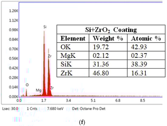 Likewise, both the coated samples (Figure 3d,f) exhibited the characteristic peaks corresponding to Zr, Si, and O. Mg and Al peaks are observed in the coating due to deep X-ray penetration, which amplifies substrate peaks.