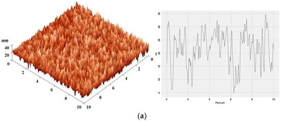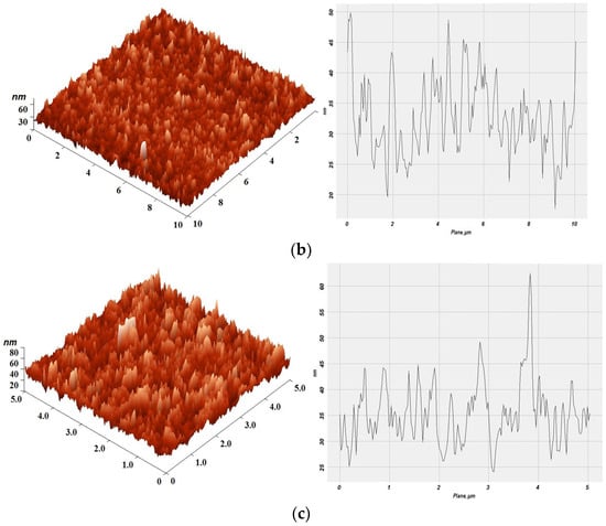 The topographical characteristics of coated and uncoated samples were analyzed using the AFM images, as shown in Figure 4. There was a 20–30% increase in surface roughness of the coated samples compared to uncoated samples, as determined by the average surface roughness of AZ91D, ZrO2, and Si + ZrO2 samples, which were 5.21 nm, 6.35 nm, and 6.85 nm, respectively. The visibility of micropores in the coating is a result of the implosions of gas bubbles. A rougher surface is produced when SiO2 forms on the substrate due to the increase in the oxide layer’s electrical resistance, which in turn requires more discharge energy []. However, the entire coated sample’s average surface roughness values were controlled to less than 10 nm through optimized coating process parameters and the purity of the coating materials.
