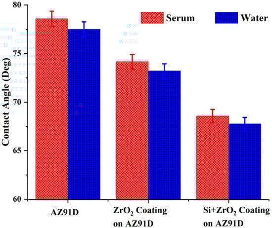 In biological applications, the hydrophilicity of an implant’s surface is an essential surface property because it encourages cell attachment and proliferation. The water and serum contact angles of the coated and uncoated samples are plotted in Figure 5. The AZ91D, ZrO2, and Si + ZrO2 sample surfaces exhibited average water contact angles of 78.58°, 74.14°, and 68.56°, respectively. Likewise, The AZ91D, ZrO2, Si + ZrO2 sample surfaces exhibited average serum contact angles of 77.48°, 73.21°, and 67.75°, respectively. The results indicate that the addition of silica greatly enhanced the wettability in both water and serum solutions as compared to the zirconia coating. Indeed, the presence of silanol groups on the surface of silica facilitates hydrogen bonding with water molecules. These polar interactions lead to an increase in the surface energy of silica, enhancing its attraction towards water and making it hydrophilic. Altogether, enhanced surface hydrophilicity of the implant facilitates the process of osseointegration, protein adhesion, and bone interaction [].