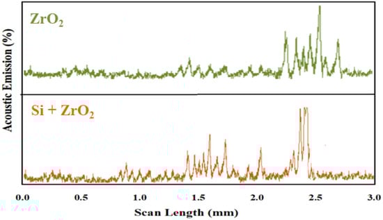 Figure 6 shows how acoustic signals indicate coating adhesion behavior under mechanical stress. Acoustic signals indicating coating deformation began at different load points for each coating. The ZrO2 coating exhibited these signals at 7.1 N, whereas the Si + ZrO2 coating showed similar signals at 6.5 N. The subtle differences in load threshold could be associated with a slight variation in coating thickness (~60 nm), influencing the adhesion properties, although the impact might be marginal. Further investigations correlating these acoustic signals with adhesion strength would provide additional insights into the influence of composition on coating performance.