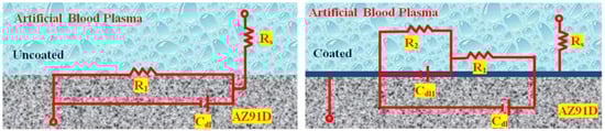 Further, the corrosion resistance of the samples was assessed using electrochemical impedance spectroscopy (EIS) with Nyquist plots, as shown Figure 8. The use of the EBPVD coating significantly enhanced the corrosion resistance of the composite coating, as shown by the considerable increase in the Rct values (Table 1). More precisely, the Rct values increased from 151 Ω (AZ91D) to 4.3 KΩ (ZrO2) and 5.2 KΩ (Si + ZrO2), indicating a substantial improvement in the coating’s corrosion resistance. Furthermore, the exceptional performance of resistance, exceeding 96% in both coatings, confirms the excellent resistance efficacy of the coatings, showing the effective sealing of surfaces, with fewer pores, strong adherence to the substrate, and uniform dispersion across the whole surface area. The coatings possess these qualities, which together enable them to effectively prevent the penetration of corrosive substances, thereby strengthening the corrosion barrier. The EIS plots revealed the equivalent circuit for both coated and uncoated samples, which is shown in Figure 9. This circuit consists of Rs, R1(Cdl), and R2(Cdl1), representing the solution resistance along with two resistances and capacitors connected in series. The circuit schematic indicates the existence of R1 and Cdl, which represents the resistance and double-layer capacitance of the uncoated AZ91D substrate. Rs denotes the electrolyte resistance of ABP, which is equivalent to the ohmic resistance. R2 and Cdl1 denote the electrical resistance and the capacitance of the double layer for coatings made of ZrO2 and Si + ZrO2.