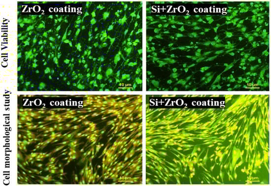 Epifluorescence images of fibroblast cell morphological and viability study on ZrO2 and Si + ZrO2-coated AZ91D alloy.