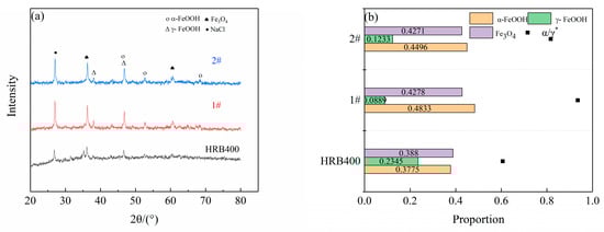 Figure 4 presents the XRD patterns of the corrosion products and the relative content of rust layer structures for the different cycles. The results were obtained using the relative intensity ratio (RIR) method, which was used in conjunction with cycle immersion tests in a 3.5 wt% (mass fraction) NaCl solution for 15, 30 and 45 days. Figure 5 illustrates the average corrosion rates of the three groups of steels. The rust layers of HRB400 and the test steels were found to consist of spinel-type iron oxides (Fe3O4 and Fe2O3) and hydroxyl iron oxides (α-FeOOH and β-FeOOH), which were collectively represented as Fe3O4 in this study, due to the similar structure of Fe3O4 and Fe2O3 (this also made them difficult to distinguish using XRD) [17]. Kamimura T et al. [18] proposed a protective ability index (PAI) of the rust layer, which is the ratio of the mass fraction of crystalline α-FeOOH to the sum of the mass fractions of γ-FeOOH and Fe3O4 (denoted as α/γ*), where a higher value indicates a better protective performance from the rust layer. In the early stages of steel corrosion, the alloying elements at the steel matrix interface promoted the charge transfer process, thereby accelerating the generation of corrosion products. Consequently, the corrosion rates of 1# and 2# were initially significantly higher than that of HRB400. However, as the corrosion time progressed, a complete protective rust layer gradually formed on the steel surface, leading to a rapid reduction in the corrosion rate.