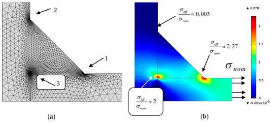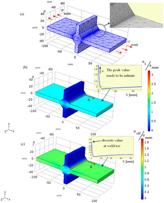 Effective stress σeff for a non-load carrying cruciform joint evaluated by solving Equation (2), assuming σeq coincides with the maximum principal stress σ1. The plate is subjected to a nominal tensile stress σnom; (a) mesh; (b) maximum principal stress σ1; (c) effective stress σeff.