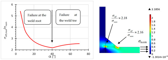 Based on the FEM analyses performed on the joint in Figure 5, Figure 7 (left) shows that a value of parameter α of about 40° divides two zones: for α values less than 40°, the maximum effective stress is at the root, while for α values greater than 40°, the maximum shifts to the toe. The geometric configuration that equalises the effective stress at the toe of the weld bead with that at the root is shown in Figure 7 (right). Therefore, the optimal condition that minimises the effective stress while maintaining L involves an angle α close to 40°.