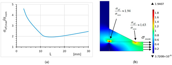 In the load-carrying weld configuration, the optimal condition is achieved when the value of parameter L is close to 14 mm. The critical zone is at the root of the weld, where the value of effective stress σeff, normalised to nominal stress σnom, equals 1.94, as shown in Figure 9. For L values between 3 and 11 mm, however, the critical zone for fatigue cracking shifts to the toe.