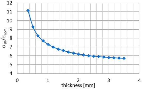 The effect of the plate thickness is considered in Figure 13. Regarding the optimal configuration, the variation in thickness leads to a progressive reduction in σeff.