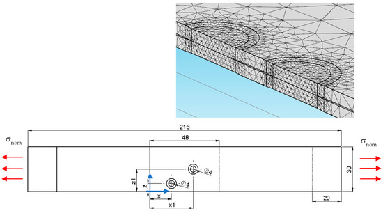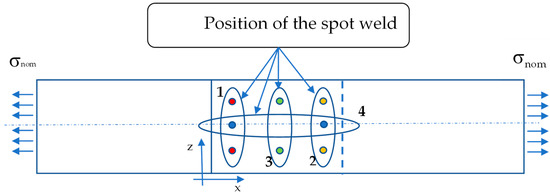 In real applications, the actual problem is usually the position of several spots, so the second considered case is the optimisation of two spots. The specimen in Figure 14 has two weld points on the overlap area of the plates that can be moved by adjusting the parameters (xi, zi). Clearly, overlapping the two weld points should be avoided. In order to simplify the calculation, only three positions in both the x and z directions have been considered.