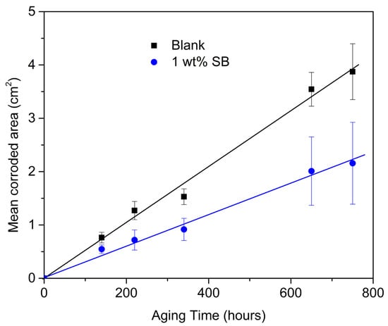 Corroded area evolution over time during 750 h of aging. The mean value calculated for three replicas is reported. Acrylic-coated steel panels with (1 wt.% SB) and without (Blank) the addition of the inhibitor are compared.