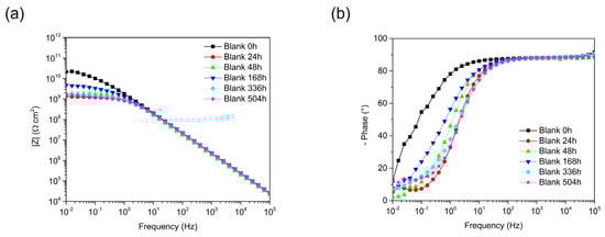EIS Bode spectra after different immersion periods collected for painted steel samples. Impedance modulus |Z| is reported on the left side (a), while a phase angle diagram is shown on the right side (b). Blank (neat acrylic paint) behavior is reported during 504 h of immersion in 0.5 M NaCl solution.