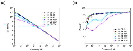 EIS Bode spectra after different immersion periods collected for painted steel samples. Impedance modulus |Z| is reported on the left side (a), while a phase angle diagram is shown on the right side (b). The behavior of the coating loaded with 1 wt.% SB is reported during 504 h of immersion in 0.5 M NaCl solution.