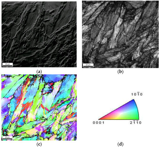 FEG-SEM/EBSD micrographs of Zr deformed by 1 ECAE pass: (a) secondary electron image, (b) indexation quality map, (c) orientation map, (d) color reference for inverse pole figure. Scale bar 20 µm.