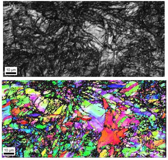 FEG-SEM/EBSD micrograph of Zr deformed by 4 ECAE passes: (a) indexation quality map and (b) orientation map. Scale Bar—10 µm.