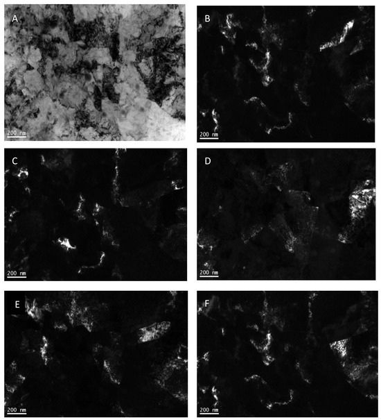 (A) TEM brightfield image of Zr deformed by 4 ECAE passes at 350 °C, (B–F) TEM darkfield images of 4 ECAE passes at 350 °C reconstructed with different diffraction spots and virtual apertures. Scale bar—200 nm.