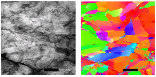 ACOM/TEM micrograph of Zr deformed by 4 ECAE passes: (a) virtual brightfield image and (b) orientation map. Scale bar—1 µm.