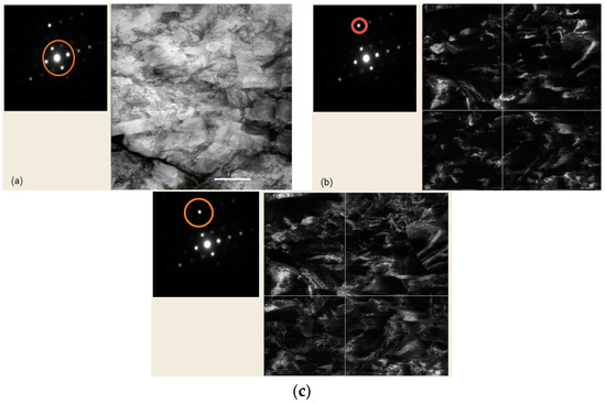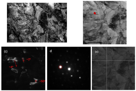 Darkfield images were reconstructed from areas where TEM brightfield images were obtained (Figure 7c). The size of the virtual objective aperture used was equivalent to a 5 µm aperture, and the misorientation was evaluated in different lines, both inside and outside the highlighted grains. The DF image presented in Figure 7c was constructed using the marked spot, from a point at the dot. The orientations of the grains indicated with the arrows had 2°, 4° and 50° misorientation. Comparing these misorientation lines with the usual definition of a grain boundary, it is possible to see how a DF image has a lower correlation than the standard definition of a grain. The conclusion is that evaluating grain size from DF images requires many fields in order to statistically determine the true grain size.