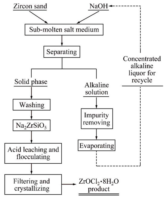 Sub-molten salt medium can effectively improve the extraction efficiency of minerals, and has been widely studied and developed in recent years. It is a medium between molten salt and ordinary electrolytes. It has the advantages of high chemical activity, a high boiling point, excellent fluidity and high activity of oxygen anion [15,16,17,18]. In our previous study, to reduce reaction temperature and pollution, we applied sub-molten salt to decompose ZrSiO4. Compared with the sintering process, the process involving sub-molten salt helps to better recycle NaOH and provides more effective environmental protection. The decomposition kinetics of ZrSiO4 in sodium hydroxide sub-molten salt were studied, and the decomposition flow chart of ZrSiO4 in NaOH sub-molten salt solution was explored, as shown in Figure 1 [19]. The product obtained owing to the decomposition of zircon sand is sodium zirconium silicate. Zirconium oxychloride is obtained by acidolysis, flocculation, filtration, and crystallization. However, in the process involving sub-molten salt, sodium hydroxide will be lost, production cost will be increased, and zirconium will be lost in the flocculation process, thus reducing the total yield of the process. When the decomposition product is sodium zirconate, the reaction product can be washed to remove sodium and silicon, omitting the acidolysis and flocculation process, shortening the process flow and increasing the total yield of the reaction.