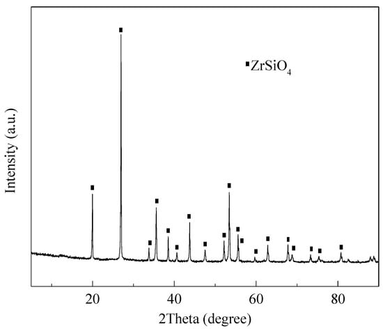 The NaOH employed was of analytical grade and was provided by the Beijing Chemical Plant, China. The water used in the experiment was deionized water, obtained by the water super purification system (Milli-Q, Millipore, Burlington, MA, USA). The main element composition of zircon sand provided by Kingan Hi-tech. Co., Ltd., Nanchang, Jiangxi Province, China was obtained by X-ray fluorescence (XRF) (AXIOS, Arlington, VA, USA). The results are listed in Table 1. The particle size of zircon sand was 22.56 μm (d50), which was measured by laser particle size analyzer (Mastersizer 2000, Malvern, UK), as shown in Figure 2. The zircon sand was characterized by X-ray diffraction (XRD, Philips 1140, Amsterdam, The Netherlands, Cu Kα radiation, 40 mA, and 30 kV) and its crystal structure was determined. The results are shown in Figure 3, and the main crystal phase is ZrSiO4. The scanning electron microscope (SEM, JSM-7610F, Tokyo, Japan) image of the particle is shown in Figure 4. It can be seen from Figure 4 that zircon sand is formed of blocky particles.