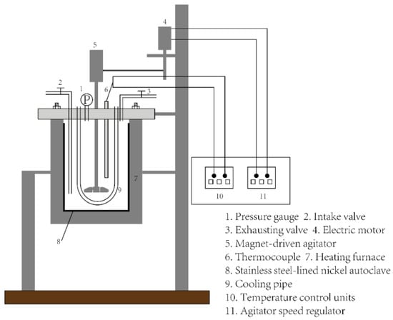 All experiments were completed in an autoclave, and the structure of the autoclave is shown in Figure 5 [19]. The autoclave was composed of a temperature control system, electric heating system, magnetic stirring system and cooling system. The volume of the inner tank was 1 L. The material of the inner tank in the autoclave was stainless steel lined with nickel. The temperature control system can adjust the heating power to maintain the reaction temperature constant with a precision of ±1 °C.