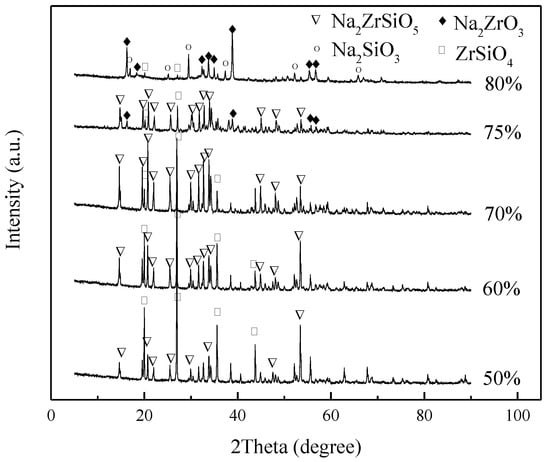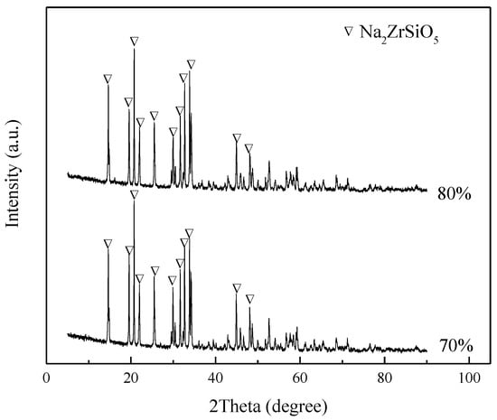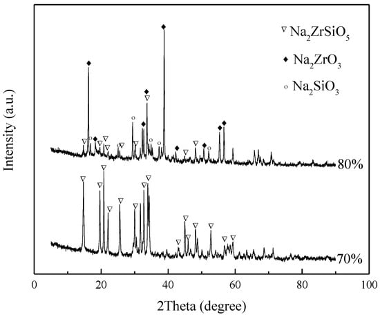 To verify our hypothesis, it is assumed that ZrSiO4 is first decomposed into Na2ZrO3 and Na2SiO3, that is, Equation (3) occurs first. Material proportions were simulated under the conditions of 70% alkali concentration, 4:1 NaOH/ore mass ratio, 260 °C reaction temperature, and 400 r/min stirring rate, as well as 80% alkali concentration, 4:1 NaOH/ore mass ratio, 260 °C reaction temperature, and 400 r/min stirring rate. It was then added to the reactor and continued to react for 4 h to obtain the product as shown in Figure 15. The figure shows that all the products under the condition of 70% alkali concentration are Na2ZrSiO5, while most of the products under the condition of 80% alkali concentration are still Na2ZrO3 and Na2SiO3; only a very small amount of Na2ZrSiO5 is produced.