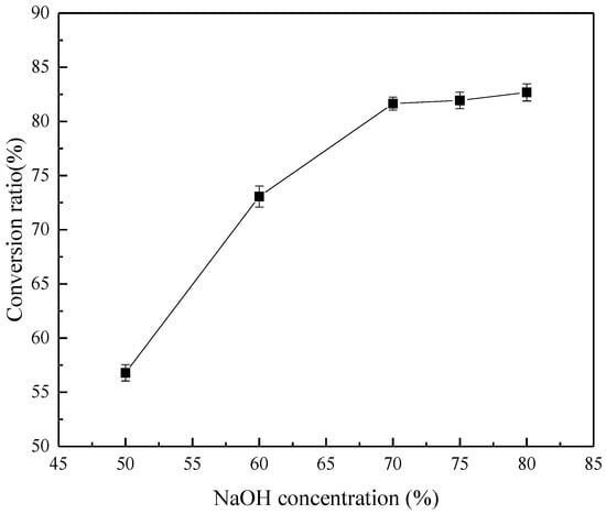Sodium hydroxide not only acts as a reactant but also affects the properties of the sub-molten salt medium. Therefore, the concentration of initial NaOH is crucial to the decomposition of zircon sand. In order to obtain the influence of initial alkali concentration on the decomposition of zircon sand, the initial alkali concentrations of 50%, 60%, 70%, 75% and 80% by mass fraction were selected as the research object, and the influence of initial sodium hydroxide concentration on the reaction product and conversion rate was studied. In the experiments, the conditions of reaction temperature 245 °C, agitation speed 400 r/min, alkali–ore ratio 3:1 and reaction time 8 h were kept constant.
