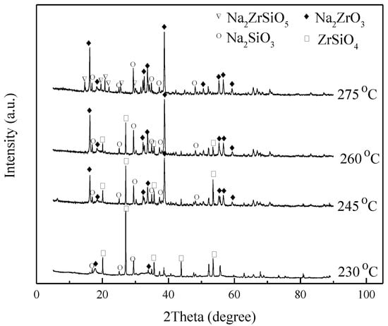 The effect of the reaction temperature on the decomposition rate of ZrSiO4 was investigated at 230 °C, 245 °C, 260 °C, and 275 °C, NaOH/ore mass ratio of 3:1, initial NaOH concentration of 80%, agitation speed of 400 r/min, and reaction time of 4 h, as shown in Figure 8 and Figure 9. The results demonstrate that the conversion of ZrSiO4 increases with temperature. The reaction products are Na2ZrO3, Na2SiO3, and unreacted ZrSiO4 at 245–260 °C. When the temperature increases to 275 °C, most of the ZrSiO4 is decomposed; however, Na2ZrSiO5 appears in the product. Therefore, to avoid the formation of Na2ZrSiO5, the reaction temperature should not be extremely high. In the following investigation, the temperature of 260 °C was selected when the effect of reaction time on the reaction products was investigated.