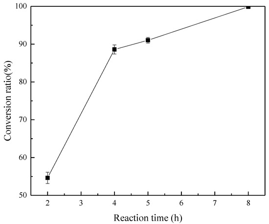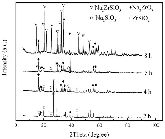 The effects of reaction time on the reaction products and conversion rate of ZrSiO4 were investigated at the conditions of reaction temperature 260 °C, agitation speed of 400 r/min, NaOH/ore mass ratio of 3:1, and initial NaOH concentration of 80%. The experimental results after reaction times of 2, 4, 5, and 8 h were obtained, as shown in Figure 10 and Figure 11.
