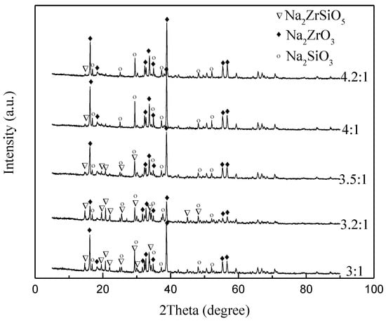 Section 3.3 demonstrates that the content of Na2ZrO3 and Na2SiO3 has an important influence on the reaction products, and the variation in the NaOH/ore mass ratio also affects the content of Na2ZrO3 and Na2SiO3 in the system. Therefore, the effects of NaOH/ore mass ratio on the decomposition products and conversion rate of ZrSiO4 were studied under the conditions of initial NaOH concentration of 80%, reaction temperature of 275 °C, agitation speed of 400 r/min and reaction time of 4 h. In Figure 12, the XRD spectra of reaction products with NaOH/ore mass ratio of 3:1, 3.2:1, 3.5:1, 4:1, and 4.2:1 were obtained. The graph shows that the diffraction peak of Na2ZrSiO5 decreases gradually with the increase of alkali/ore ratio. When the NaOH/ore ratio increases to 4.2:1, there is almost no Na2ZrSiO5 in the product. According to the graph of conversion (Figure 13), ZrSiO4 with a different NaOH/ore mass ratio is almost completely decomposed.