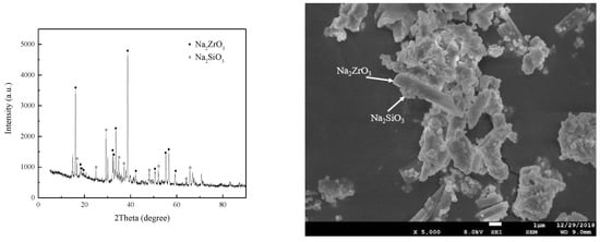 The SEM image and XRD patterns of the product on the optimum technological conditions are shown in Figure 14. It can be seen from the figure that almost all ZrSiO4 is decomposed, and the products are Na2ZrO3 and Na2SiO3. Na2ZrO3 consists of rod-shaped particles.