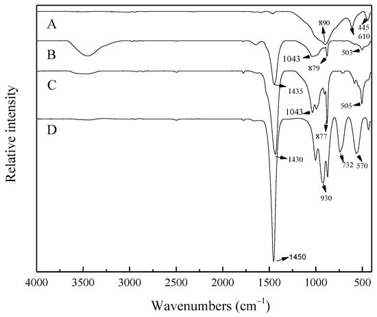 Infrared spectra of ZrSiO4 and the products in the NaOH sub-molten salt with different reaction time. A: ZrSiO4, B: 1 h, C: 2 h, and D: 8 h.