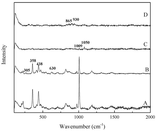 Raman spectra of ZrSiO4 and the products in the NaOH sub-molten salt with different reaction times. A: ZrSiO4 B: 1 h C: 3 h D: 8 h.
