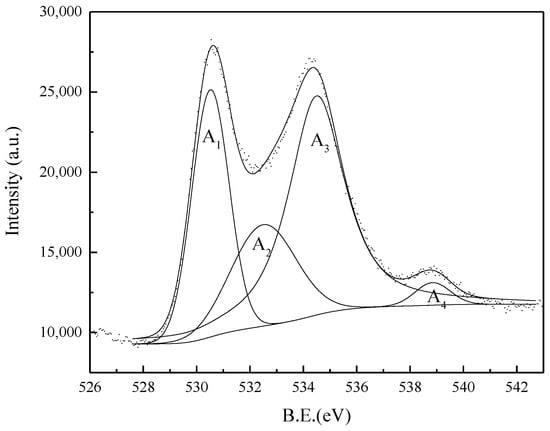 A chemical analysis of the product from ZrSiO4 in NaOH sub-molten salt (reaction temperature of 260 °C, NaOH content of 80%, agitation speed of 400 r/min, NaOH/ore mass ratio of 3:1, and 1 h reaction time) was conducted using XPS, which is known to be a highly surface-sensitive technique. Figure 19 shows that the O 1s spectrum from ZrSiO4 after its reaction in NaOH sub-molten salt leads to the attribution of four distinct chemical species of O atoms, by resolving the O 1s spectra into four spin-orbit pairs with BEs of 530.5, 532.5, 534.5, and 538.8 eV, respectively. Among these four O 1s BE components, the 530.51 eV can be assigned to the O 1s BE of O present in the ZrO2; 532.50 eV, O 1s BE of O in the Si-O-Si; 534.5 eV, O 1s BE of O in the Na2ZrO3; and 538.8 eV, O 1s BE of O in the Na2CO3, which is formed when sodium hydroxide absorbs carbon dioxide from the air [28,29,30].