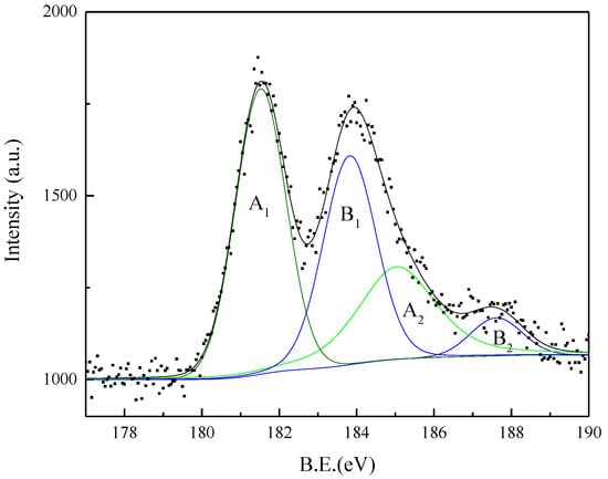 In addition to the O 1s spectrum, the sample was also scanned for a Zr 3d signal. The BE of Zr 3d in Figure 20 can be fitted to two pairs of peaks of A1, A2 and B1, B2. The BEs of A1 and A2 are 188.5 eV and 185.0 eV, respectively, which correspond to the BE of Zr 3d in ZrO2 [28,31]. Further, ZrO2 appears on the surface of ZrSiO4 particles, which is consistent with the results of infrared and Raman analyses. The BEs of B1 and B2 are 183.8 eV and 187.6 eV, respectively, corresponding to the BE of Zr 3d in Na2ZrO3.