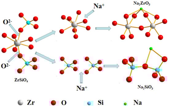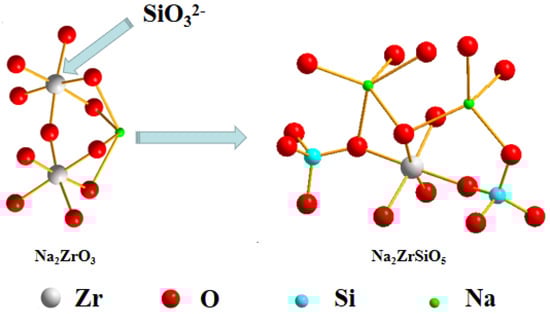 The analysis indicates that the decomposition reaction of ZrSiO4 in NaOH sub-molten salt occurs as the zircon–oxygen polyhedron is separated from the silicate lattice under the action of sub-molten salt, which separates zirconium and silicon. Previous studies have demonstrated that there are several stable O2−, which is Lewis alkaline, from the decomposition of OH− in the sub-molten salt system compared with conventional media. Therefore, when decomposing zircon sand in sub-molten salt, the highly active O2− tends to attack the Zr atom in zircon sand, replacing the O in the crystal structure, promoting the formation of new Zr–O bonds, thus breaking the ring crystal structure. The zirconium–oxygen polyhedron is separated from silicate lattice, resulting in the separation of zirconium and silicon. The silicon–oxygen polyhedron and zirconium–oxygen polyhedron form chain-shaped sodium silicate and sodium zirconium, respectively, under the action of Na+. When the water content in the system increases, that is, the alkali concentration decreases, the Na2SiO3 produced will ionize under the action of water molecules to produce SiO32−. SiO32− will attack the Zr atom in Na2ZrO3 and enter the lattice of Na2ZrO3 to form a new island-like silicate (Na2ZrSiO5). With the increase of alkalinity, the solubility of Na2SiO3 decreases, SiO32− in the system decreases, and rate of Na2ZrSiO5 formation slows down, which is the same as the previous analysis results. Therefore, the reaction mechanism of NaOH sub-molten salt decomposition of ZrSiO4 is to decompose Na2ZrO3 and Na2SiO3 sodium under the action of O2− and then combine them to form Na2ZrSiO5 under the action of ionization of SiO32−, as shown in Figure 21 and Figure 22.
