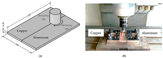 Our study involved the production of butt-welded specimens utilizing aluminum alloy AA6061-T6 and copper C11000, each with dimensions of 150 mm × 50 mm × 4.76 mm, as illustrated in Figure 1a,b. The material compositions are in Table 1. Table 2 includes the electrical conductivity of the materials in terms of % IACS. This term refers to the International Annealed Copper Standard, which provides a baseline for comparing the electrical conductivity of various materials with that of annealed copper []. The tool used featured a concave shoulder of 27 mm in diameter and a threaded cylindrical probe with a 5 mm diameter. The advancing side, where the FSW tool actively stirred and plasticized the material, was made of aluminum, while the retracting side was copper. This information was based on findings by authors such as Eslami et al., Yusof et al., and Argesi et al., which illustrated the production of sound weld joints using this configuration [,,].