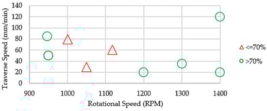 Based on the conducted review, Figure 3 categorizes rotational and traverse speeds into two distinct groups: those falling below an efficiency of 70%, and those surpassing it. The selection of thicknesses ranging between 2 and 3 mm was driven by the requirements of the conducted trials and the CNC machine limitations. Figure 3 includes a summary of the reviewed parameter combinations and joint efficiency. The red triangles represent efficiencies below 70%, while the green circles indicate efficiencies above 70%, showing that most traverse speeds are between 20 mm/min and 85 mm/min and the range for rotational speed is 950 to 1400 RPM. It should be noted that higher rotational speeds tend to lead to higher efficiencies. Table 4 shows the parameters selected for the trials; the selection was initially based on the biographical review that is summarized in Table 3. Once the ranges of interest were identified, an experimental plan was proposed that used visual inspection of the joints as the first quality assessment. In the specific case of the feed rate in this experimental exercise, it was limited to a value that would be safe for the machine, similar to the use of flip welding to maintain the integrity of the equipment used.
