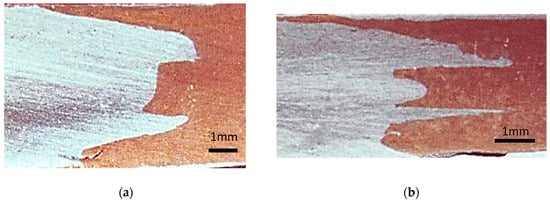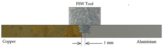 Offset is a parameter that is commonly used in dissimilar joints to account for differences in the properties of materials. Figure 4 includes a schematic of the offset selected for the trials. This tool movement compensates for variations in mechanical and thermal properties between workpieces, thereby controlling the distribution of heat in the joint []. In this case, and as some authors have suggested, the tool was moved towards the aluminum [,].