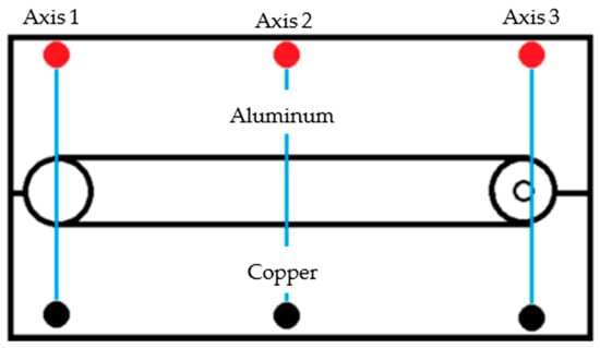 The assessment was performed at three different locations along the weld: when the FSW tool entered the workpiece (axis 1), when it advanced through the joint (axis 2), and when the FSW tool was extracted (axis 3), as shown in Figure 6.