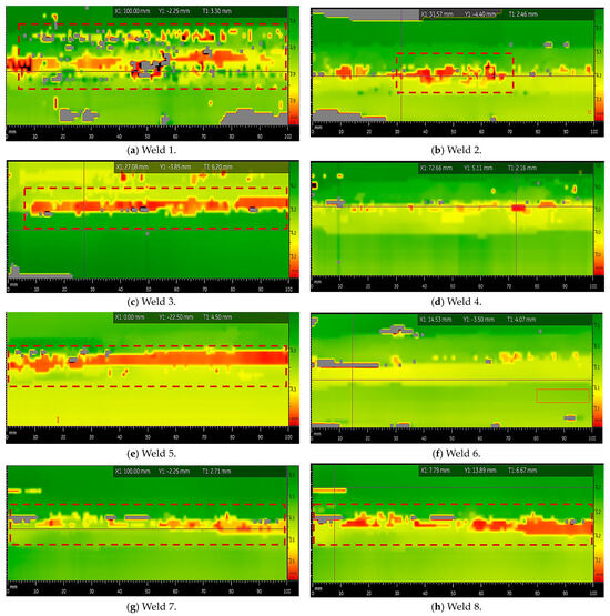A phased-array ultrasound was conducted on eight plates corresponding to the welding executed. Non-destructive testing was conducted using the Phased Array General Electric equipment (Mentor UT model) equipped with a 32-crystal transducer (serial number 17I00CJH). The GE 20D00T4A transducer and software designed for measurements with a 32° crystal beam were utilized. Adjustment was performed using the calibration ladder with the serial number GE V39377. The PAU results can be seen in Figure 7.
