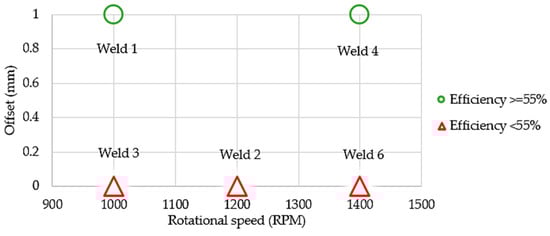 Figure 8 includes a comparison of the process parameters (offset and rotational speed) with the resulting joint efficiency. The transverse speed was kept constant at 40 mm/min during the welding process.