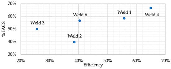 As shown in Table 5, all the welds except weld 5 had an average % IACS higher than that of aluminum (39%), but in all cases, it was lower than that of copper. The best results were seen in weld 4, with 66.3%, which is also the soundest joint based on the PAU images. Weld 6 presented a higher uniformity across the three axes, with values of approximately 56.3% and a standard deviation of 4.4%.