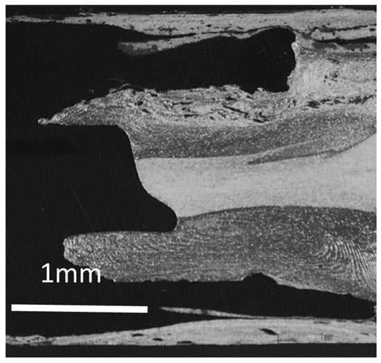 Figure 10 includes a stereoscopic image from a weld executed at 1000 RPM and 40 mm/min (weld 1). In this figure, it is possible to observe a higher level of mixing with the use of offset, with an increase in material flow from the softest material—aluminum, in this case—to the most rigid. This observation is further confirmed in Figure 11 by the presence of lines indicating significant and heterogeneous plastic deformation on the aluminum side.