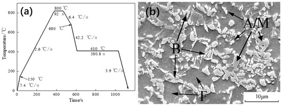 (a) Continuous annealing process diagram of the TRIP600 steel; (b) metallographic photos of experimental materials; F represents ferrite, B represents bainite, A represents austenite, and M represents martensite.