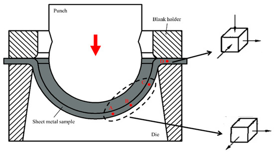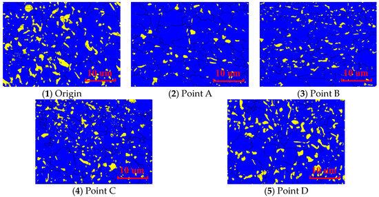 The cupping test is a reliable method for evaluating the strength and deformation ability of sheet materials and is commonly used to assess the forming properties of sheet metal. The test process is illustrated in Figure 3. During the test, the blank holder presses the sheet metal while the ball head punches at a pre-determined speed until cracks appear on the protruding part of the sheet metal. In this study, the sheet sample had dimensions of 90 mm × 90 mm and a thickness of 1 mm. Prior to the test, graphite grease was evenly applied to both sides of the sheet sample and the punch. The sample was then clamped between the pressing die and the cushion die after zero setting. The clamping force was set to 10 kN, and the punch speed was varied at 0.1 mm/s, 0.5 mm/s, 1.0 mm/s, 5.0 mm/s, and 10.0 mm/s. The test utilized a spherical end punch with a stamping-sensitive value set at 1000 N. When this value was reached, the equipment automatically unloaded, and the depth of the sample at this point was recorded as the IE value. Specifically, for a speed of 1.0 mm/s, four key points (A–D) were selected for phase transition analysis using EBSD, as depicted in Figure 3. The EBSD experiment was conducted using the HKL Nordlys electron backscatter diffraction analysis system equipped with a ZEISS ULTRA 55 thermal field emission scanning electron microscope at a magnification of 3000 times and a scanning step size of 0.1 um/s.