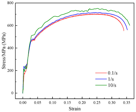In order to assess the influence of different rates on the martensitic transformation, a series of tensile tests were conducted on the GLEEBLE 3500 thermal simulator produced by DSI (St. Paul, MN, USA). The experiment involved three different tensile rates: 0.1 s−1, 1 s−1, and 10 s−1. The stress–strain curves of TRIP600 were measured at each of these rates.