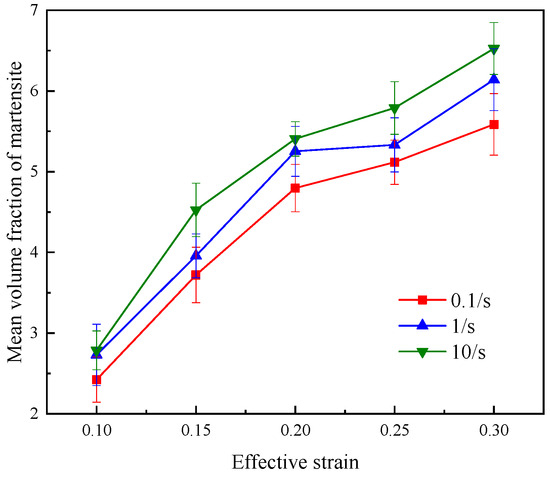 Figure 5 reveals the influence of strain rate on the martensite transformation. The effective strain here refers to the effective plastic strain, and the effective plastic strain at the yield point is zero. In the stress–strain curve, it is equivalent to removing the elastic segment. It is evident that, at the same strain level, the volume fraction of martensite increases with higher strain rates. High strain rates result in a greater extent of martensite transformation. Martensite, being a hard phase, enhances the material’s resistance to deformation. During continuous deformation, if the material cannot effectively reduce deformation resistance through thinning, it eventually leads to fracture.