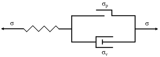 where is the total strain, is the elastic strain, is the viscoplastic strain, and and are the strains of the dashpot and the friction piece, respectively. The spring stress, i.e., the elastic stress , conforms to Hooke’s law and is equal to the total stress σ: