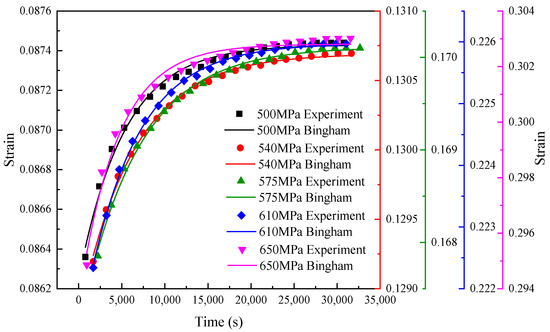 Equation (11) is used to fit the strain–time data obtained from the creep test, and the coefficient values in the formula are shown in Table 3, and then the parameter values of the Bingham model are shown in Table 4. Thus, the strain–time equation of TRIP600 under different stress states is obtained. The test data and fitting curve are shown in Figure 9.